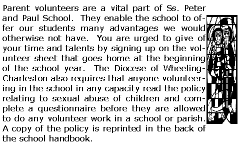 Ss. Peter & Paul Parent-Teacher Organization (PTO) provides an opportunity for teachers and parents to work together for the welfare of the students and betterment of the school. Parents are strongly encouraged to attend all functions of the PTO and to support all fundraisers. All parents are asked to work Bingo five times during the year. The funds raised through Bingo go entirely to supplement tuition. Parents opting to not work Bingo must pay the Bingo assessment.